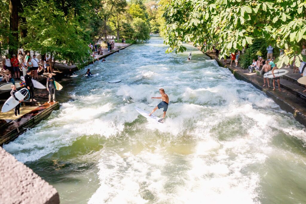 - The Eisbachwelle is a standing wave where surfers ride all year round, even in the snow.